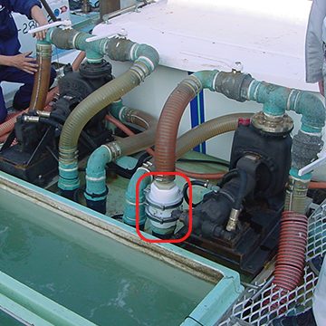 船舶ポンプに接続されたホースの間に設置。海面作業時の酸素補給や、船舶生け簀内への酸素供給など、幅広くご使用いただけます。